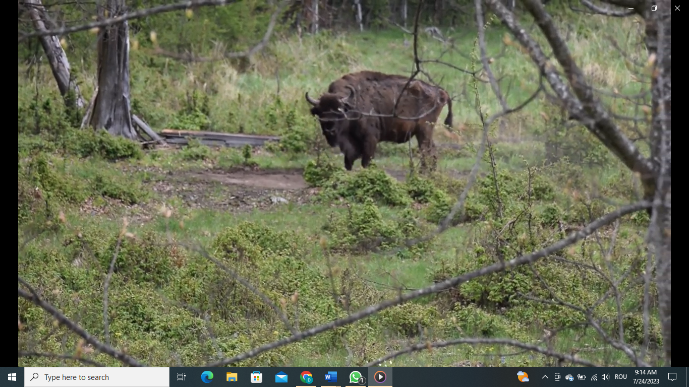 Copleșit de căldură, sau poate doar ca să se scarpine, un zimbru face o baie de praf într-un luminiș din Parcul Natural Vânători Neamț. În cele câteva secunde cât durează filmarea, zimbrul se bucură de singurătate, de cântecul păsărilor și de locul unde, cu două-trei zile înainte, fusese un ochi de apă format în urma ploii.