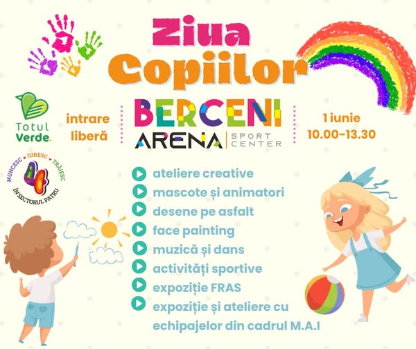 Nu doar astăzi este sărbătoare la complexul Berceni Arena; mâine, de 1 iunie, copiii sunt invitați împreună cu părinții sau bunicii la un eveniment cu zone tematice, ateliere creative, demonstrații sportive și recitaluri.