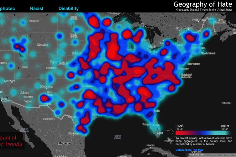O hartă a mesajelor de pe Twitter arată cât de viu este hate speech în SUA. Harta agregă 150 000 de insulte în decursul a 11 luni și scoate la iveală adevărate furtuni ale urii. Sursa: The Geography of U.S. Hate, mapped Using Twitter, http://newsfeed.time.com/2013/05/20/the-geography-of-u-s-hate-mapped-using-twitter/.