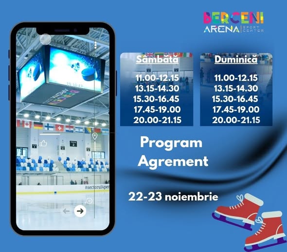 Programul special pentru public din acest weekend, 22 și 23 noiembrie, include două zile complete de patinaj pentru copii și familie. Mai jos, programul sesiunilor.